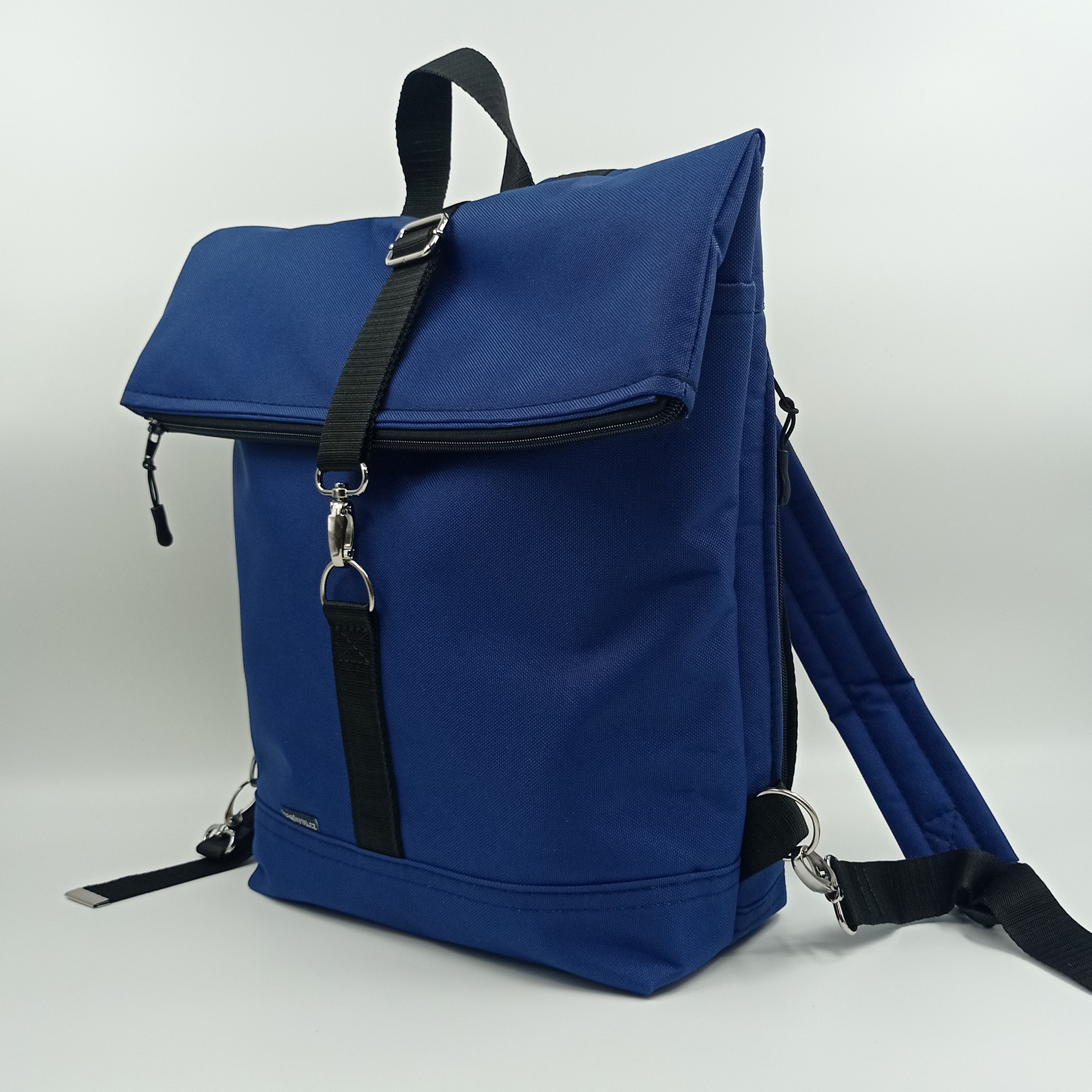 Nepromokavý batoh MAIA v středně modré barvě s roll-up zavíráním vhodný pro dámy, které preferují menší batoh se zádovou kapsou.