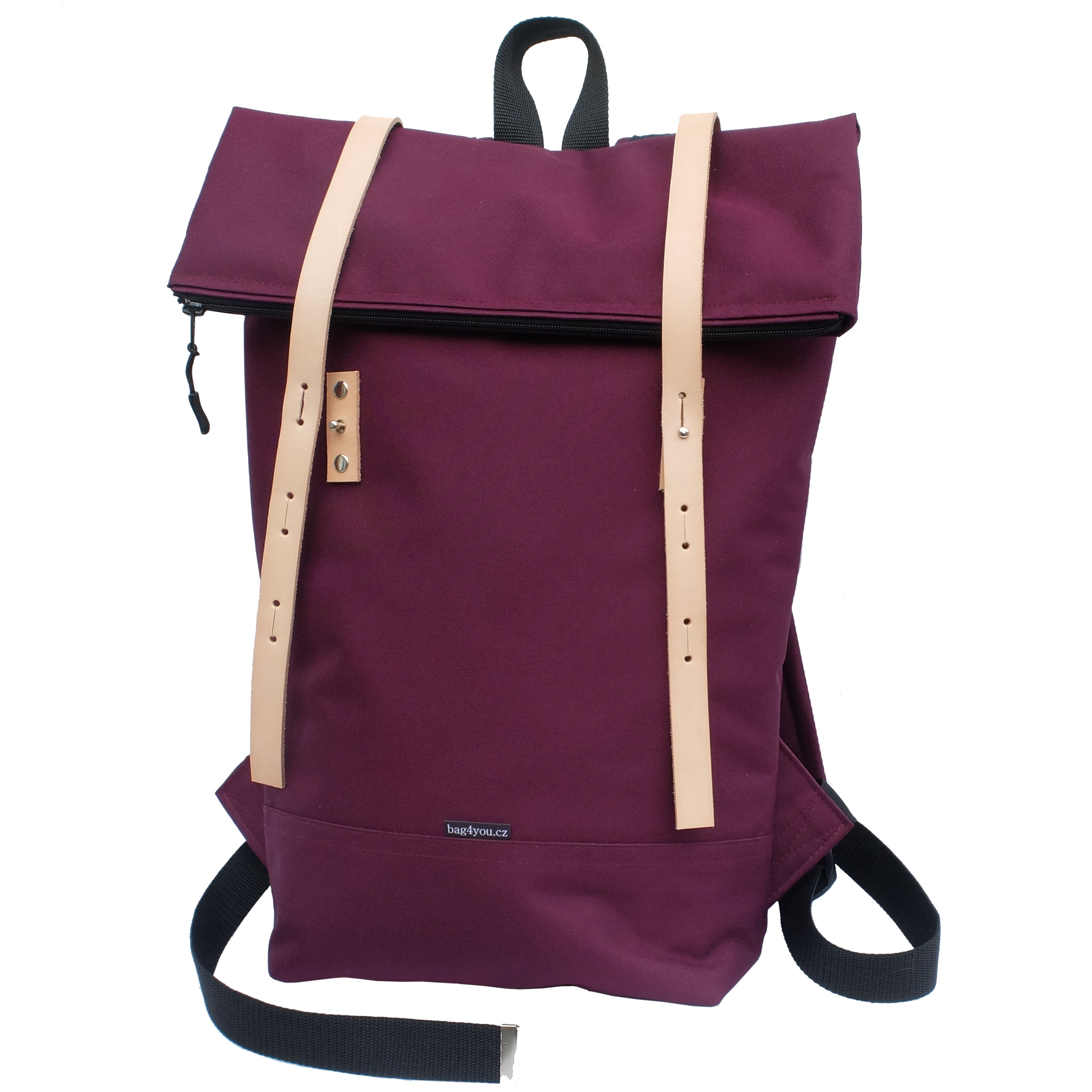Nepromokavý batoh TIBET 22 ve vínové barvě s roll-up zavíráním na zip a kožené pásky.