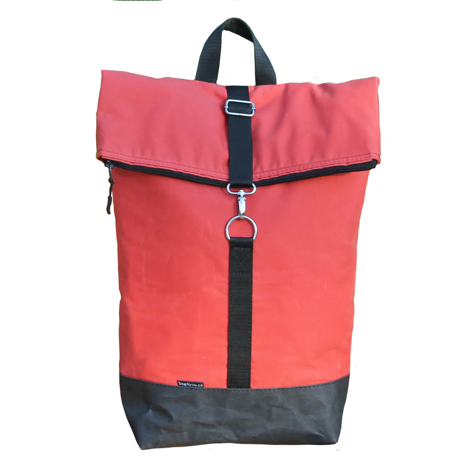Nepromokavý batoh WAXED CANVAS 05 v červené barvě s roll-up zavíráním a zádovou kapsou.