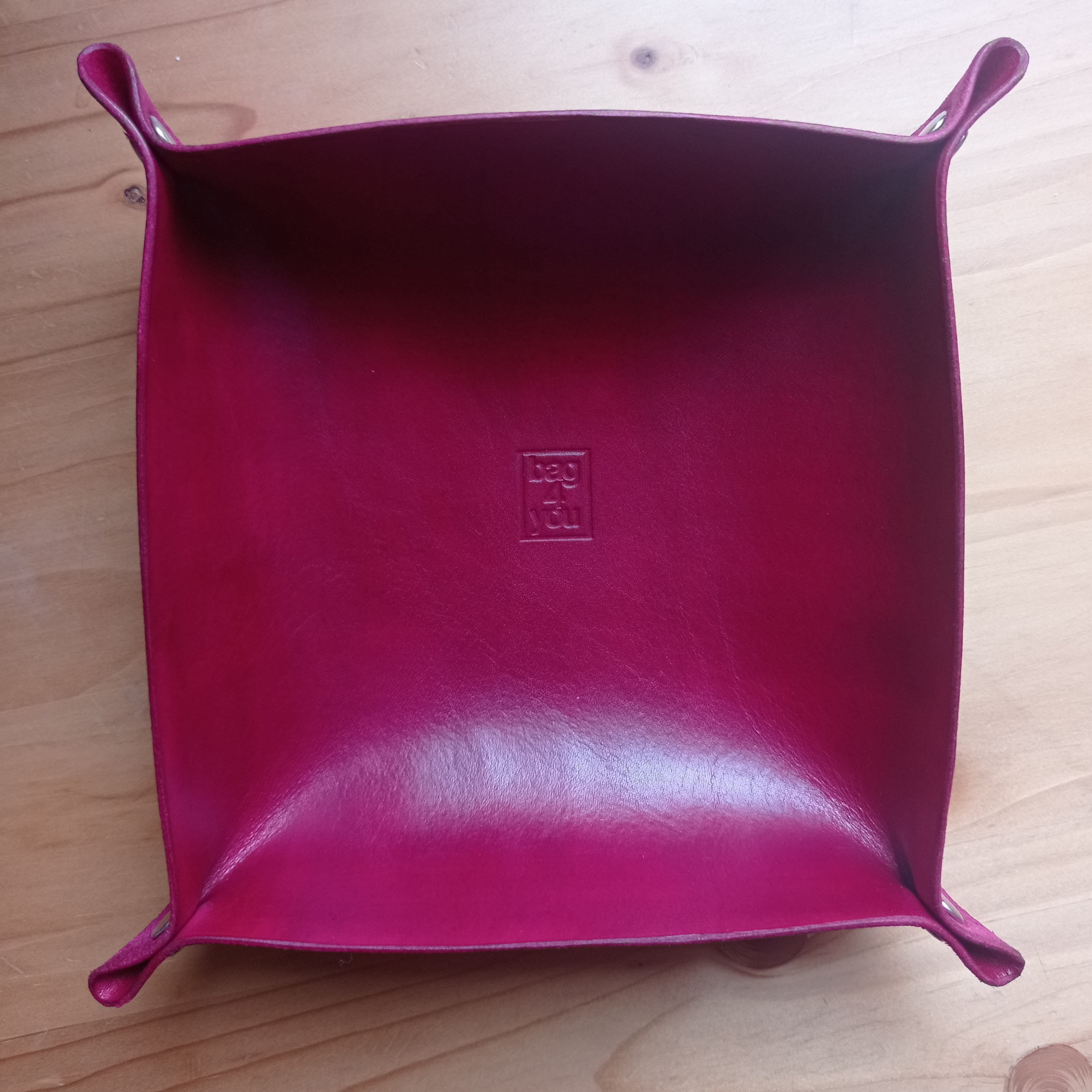 Kožená miska na odkládání drobných věcí v červené barvě. Je zhotovena z přírodní třísločiněné usně, která byla vyrobena v české koželužně.